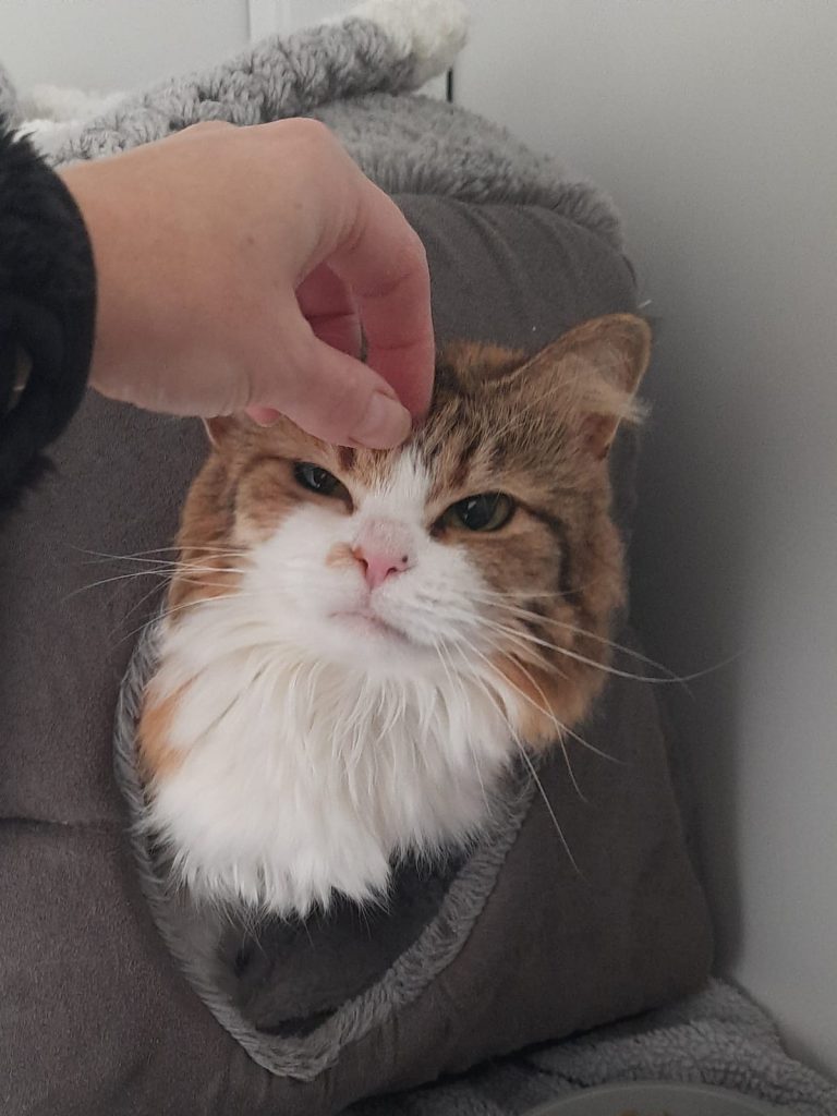 She is shy, but enjoys lots of fuss and a cosy home. She has been known to cosy up in bed with her owners.