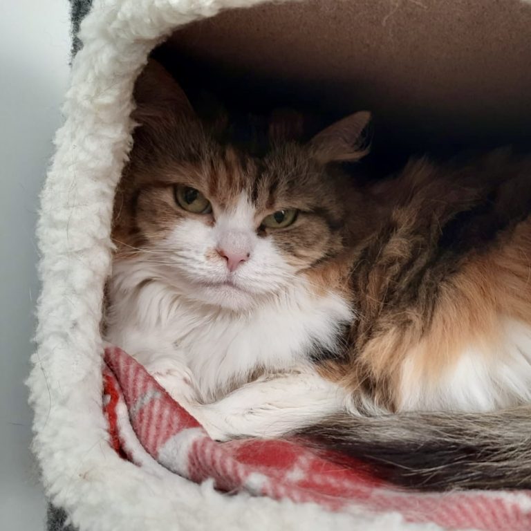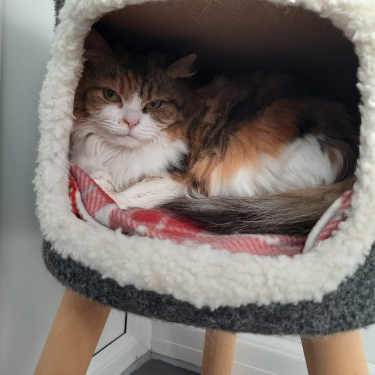 Willow is a lovely seven year old Norweigen Forest cross calico cat.
