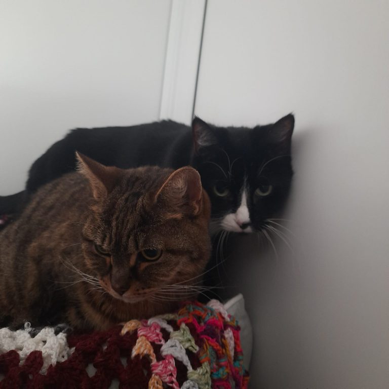 Cleo is the slender black and white lady and Nala is the shyer tabby lady.