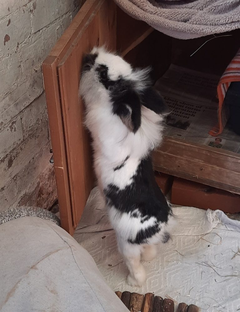 She is a friendly, gentle girl who enjoys a fuss and attention. She could live with older children. She likes a comfy spot on a raised platform to chill out and also likes to explore, so she will need space to do so with tunnels, boxes and space to binky about.