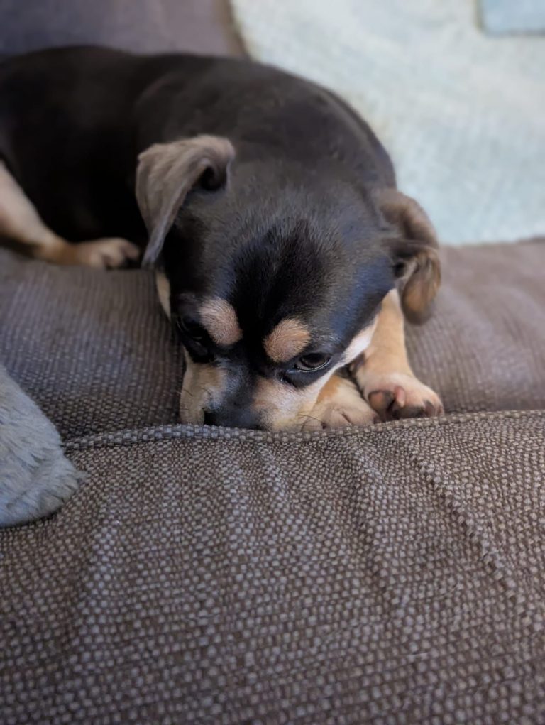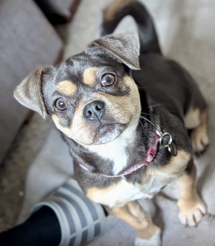 Peggy adores her soft toys, loves to zoom around, and is happiest when she’s with her humans. She has a strong Pug-like attachment to her people and will need someone who can be around more often, especially at first, to help her settle.