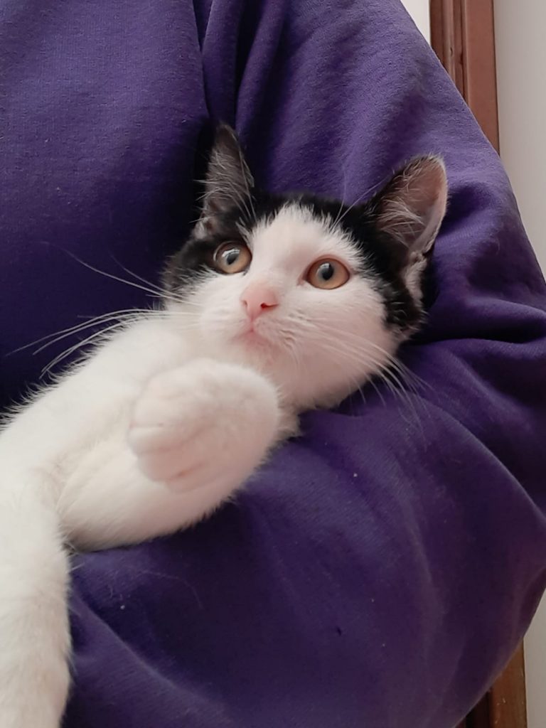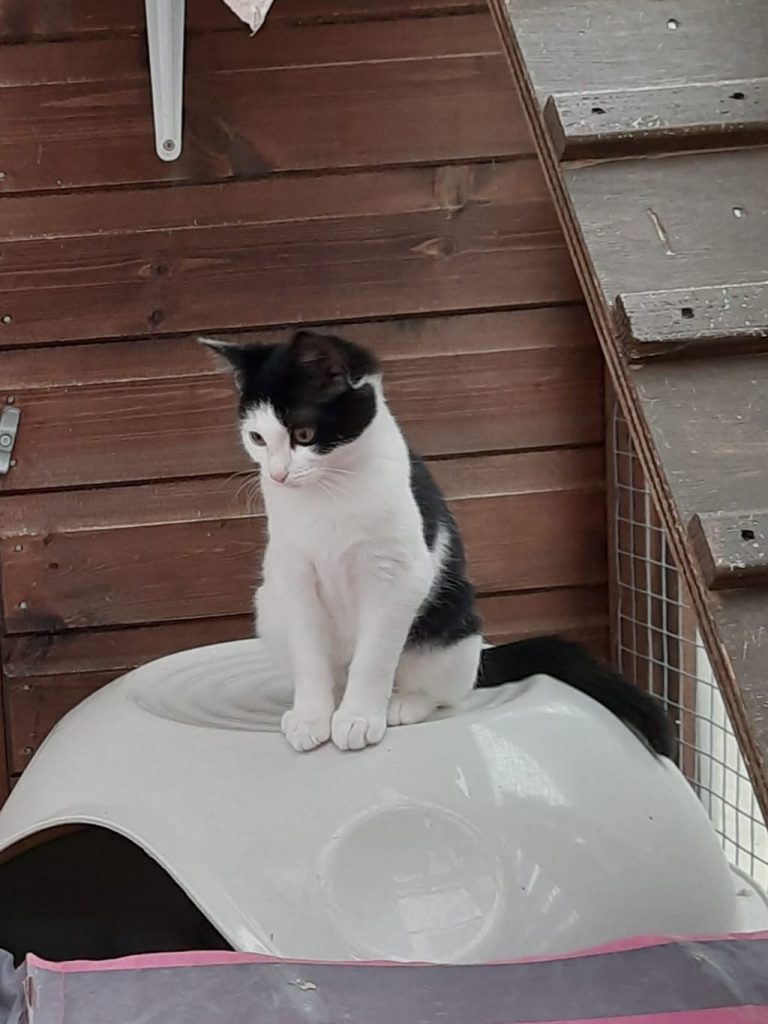 Cupcake is a black and white short haired female. Crumpet is the much larger tabby and white male, he loves to snuggle up to Cupcake and to play with her gently.
